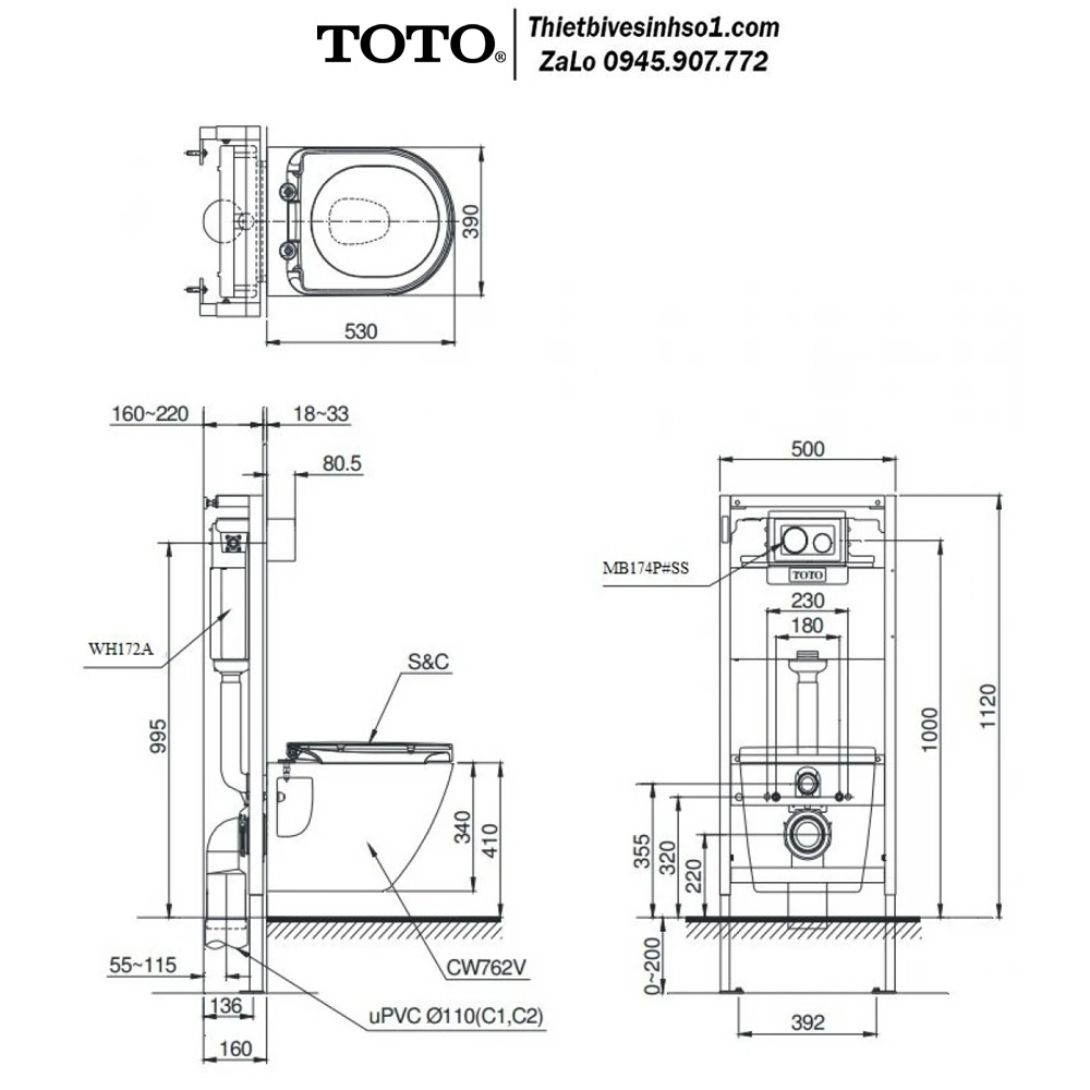 Bản Vẽ Bồn Cầu Treo Tường TOTO CW762-TC384CVK-WH172A-MB176G