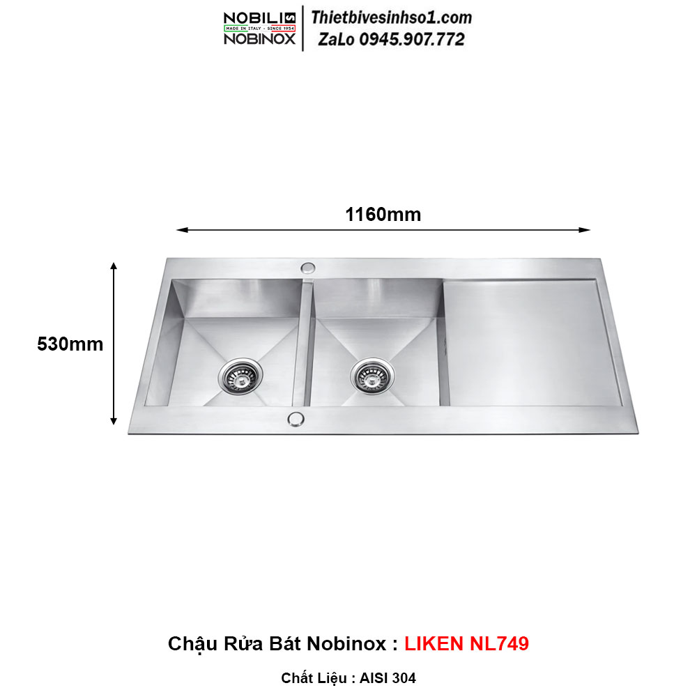 - Kích Thước: 1160x530x230 mm - Kích Thước Cắt Dương: 1130x500 mm - Chất Liệu : AISI 304 - Mã Sản Phẩm : Nobinox LIKEN NL749 - Xuất Xứ : PRC - Bao Gồm : Bộ Xi Phông + Thớt Tre + Dây Lưới + Rổ - Chưa Bao Gồm Vòi Rửa