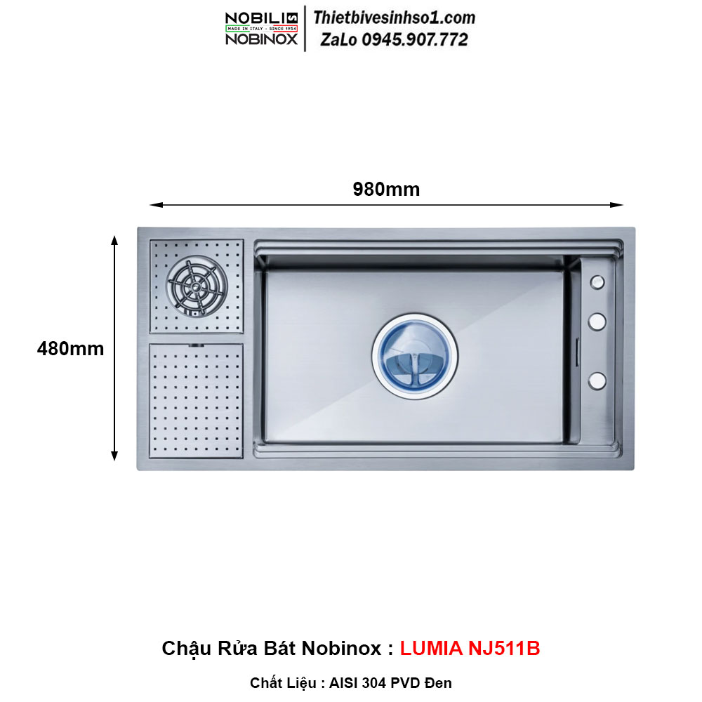 - Kích Thước: 980x480x230 mm - Kích Thước Cắt Đá Âm: 928x428 mm - Chất Liệu : AISI 304 PVD Đen - Mã Sản Phẩm : Nobinox LUMIA NJ511B - Xuất Xứ : PRC - Bao Gồm : Bộ Xi Phông + Thớt Gỗ + Xịt Cốc + Hố Rác + 2 Tấm Đậy + Rổ LK + Khay LK + Bình Đựng Nước Rửa Bát - Chưa Bao Gồm Vòi Rửa