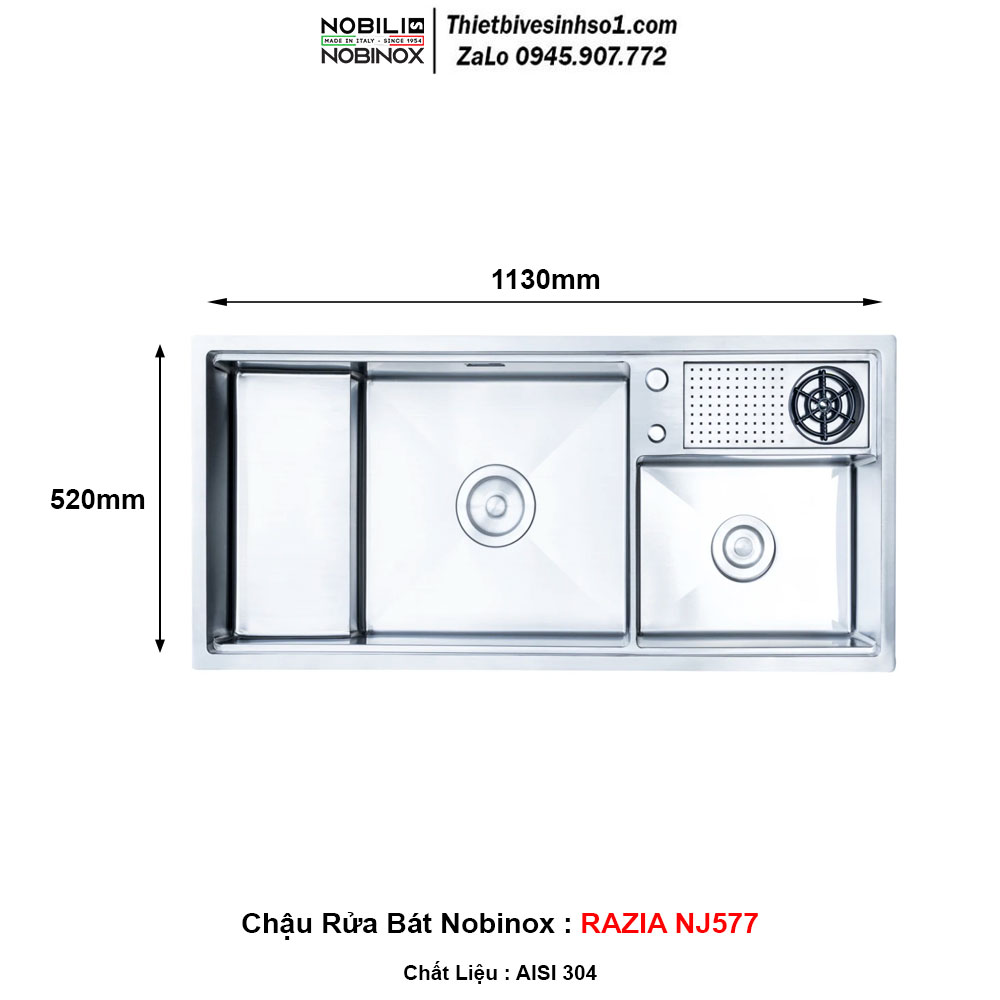 - Kích Thước: 1130x520x230 mm - Kích Thước Cắt Âm: 1080x470 mm - Chất Liệu : AISI 304 - Mã Sản Phẩm : Nobinox RAZIA NJ577 - Xuất Xứ : PRC - Bao Gồm : Bộ Xi Phông + Thớt Gỗ + Rổ JL + Khay VY + Thớt inox + Xịt Cốc + Bình Đựng Nước Rửa Bát - Chưa Bao Gồm Vòi Rửa