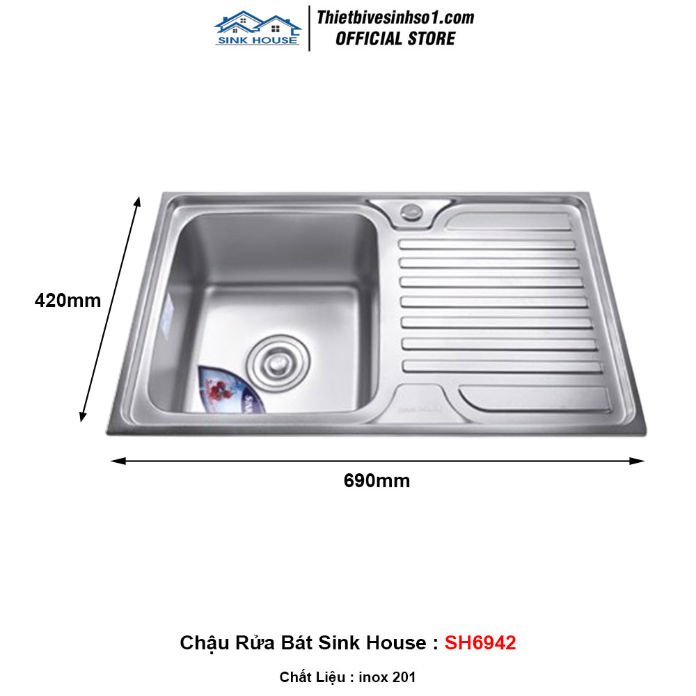 - Kích Thước : 690x420x220 mm - Chất Liệu: inox 201 - Model: Sink House SH6942 - Kiểu Dáng : 1 Hố - Bao Gồm : Xi Phông Thoát Nước
