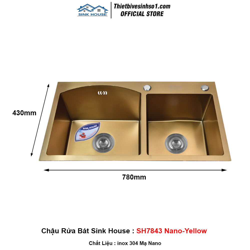 - Kích Thước : 780x430x230 mm - Độ Dày : 4 mm - Chất Liệu: inox 304 Mạ Nano - Model: Sink House SH7843 Nano-Yellow - Kiểu Dáng : 2 Hố - Bao Gồm : Xi Phông Thoát Nước