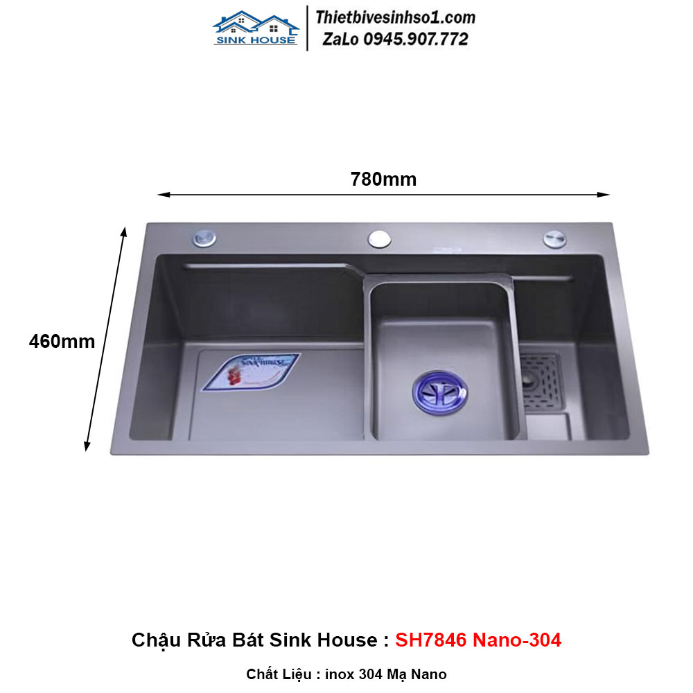 - Kích Thước : 780x460x230 mm - Chất Liệu: inox 304 Mạ Nano - Model: Sink House SH7846 Nano-304 - Kiểu Dáng : 1 Hố - Bao Gồm : Xi Phông Thoát Nước + 1 Chậu Nhỏ