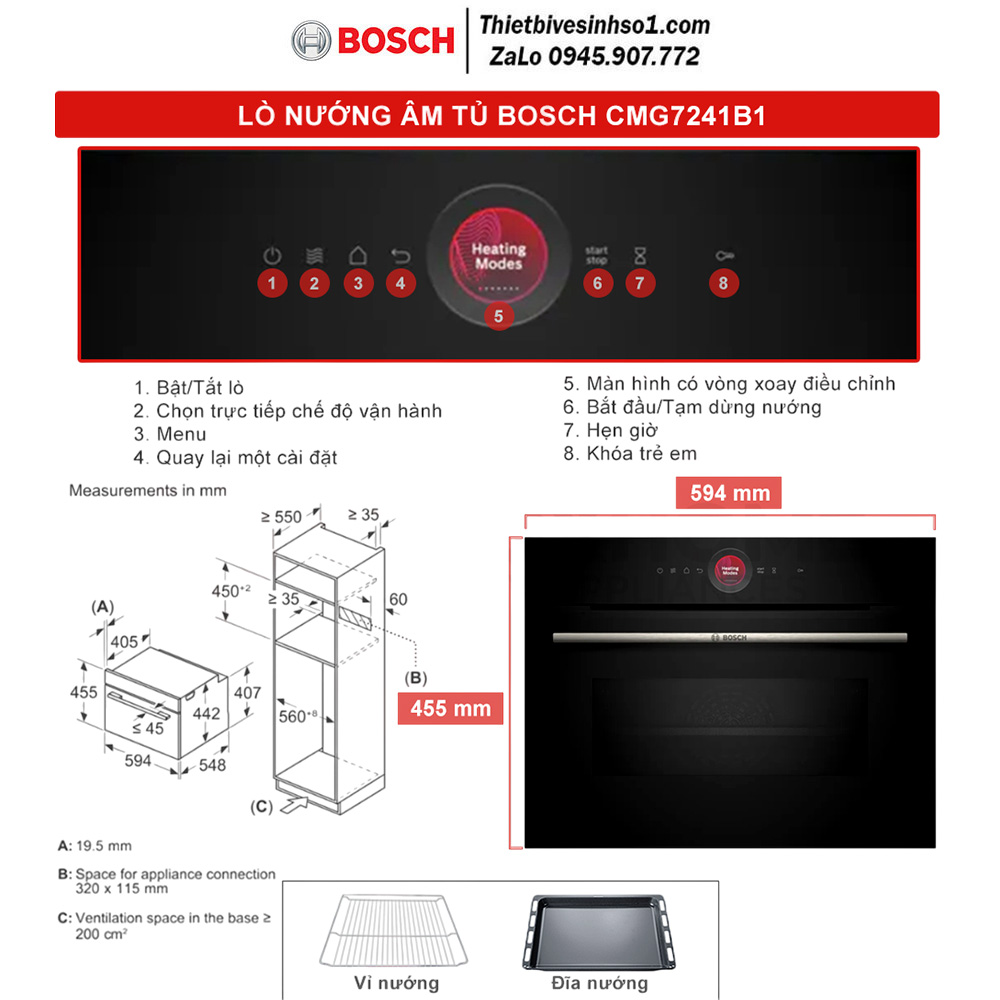 - KT : 595x594x548 mm - KT Âm Tủ : 585-595 x 560-568 x 550 mm - Bảo Hành : 3 Năm - Mã Sản Phẩm : Bosch HRG7361B1 Seri 8 - Xuất Xứ : Đức - Điện Áp : 220-240V/50Hz