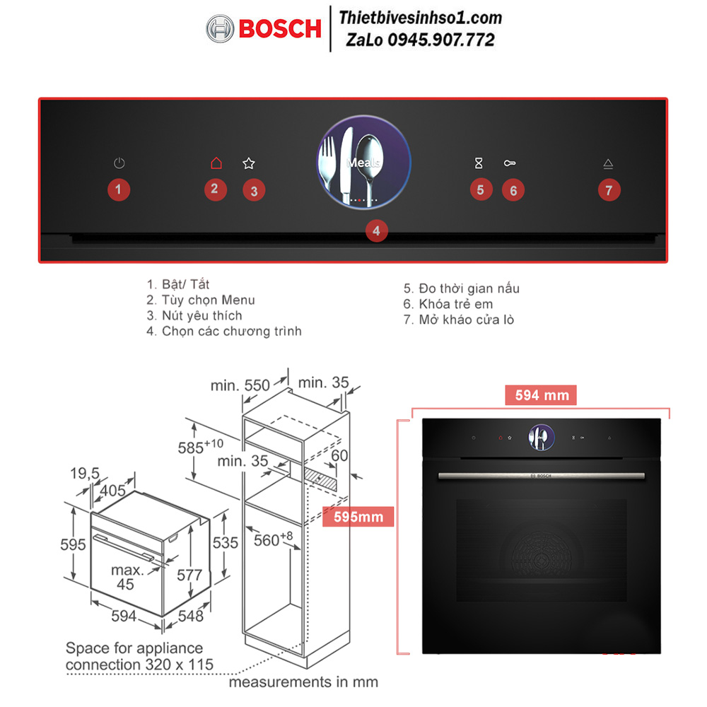 - KT : 595x594x548 mm - KT Âm Tủ : 585-595 x 560-568 x 550 mm - Bảo Hành : 3 Năm - Mã Sản Phẩm : Bosch HRG7361B1 Seri 8 - Xuất Xứ : Đức - Điện Áp : 220-240V/50Hz